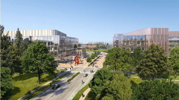 As for what the new buildings might look like, well, the developer did include some attractive renderings that give us some idea of how the resulting campus might appear (but of course take these with a grain of salt; the project is very preliminary at this point and likely will change in the upcoming months and years):
