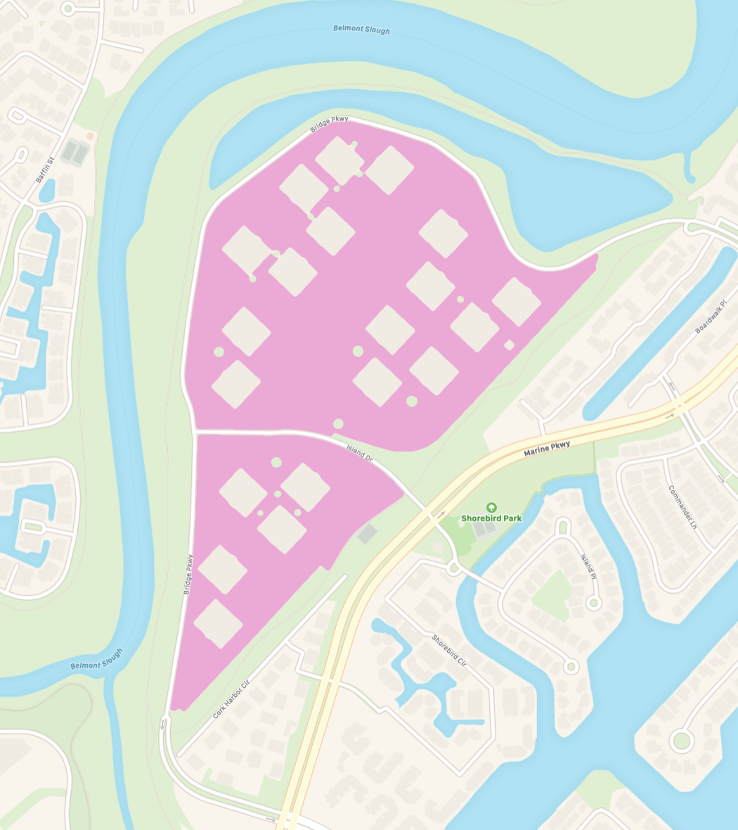 The project site is to the northwest of Marine Parkway, and separated from that road by a wide grass strip (which also helps to separate it from some nearby homes). Bridge Parkway curves around the property, and Island Drive cleaves the site in two. The grayish squares within the pink area shown above represent the buildings on the site today. There are four with an Island Drive address (900, 975, 1100, and 1300 Island Dr.) and 16 with a Bridge Parkway address (800, 1000, 1200, 1400, 1600, 1800, 2000, 2200, 2400, 2600, 2800, 3000, 3200, 3400, 3600, and 3800 Bridge Pkwy.)