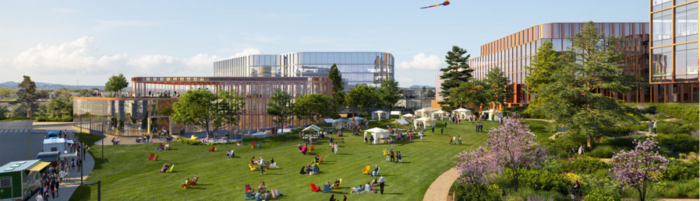 As for what the new buildings might look like, well, the developer did include some attractive renderings that give us some idea of how the resulting campus might appear (but of course take these with a grain of salt; the project is very preliminary at this point and likely will change in the upcoming months and years):