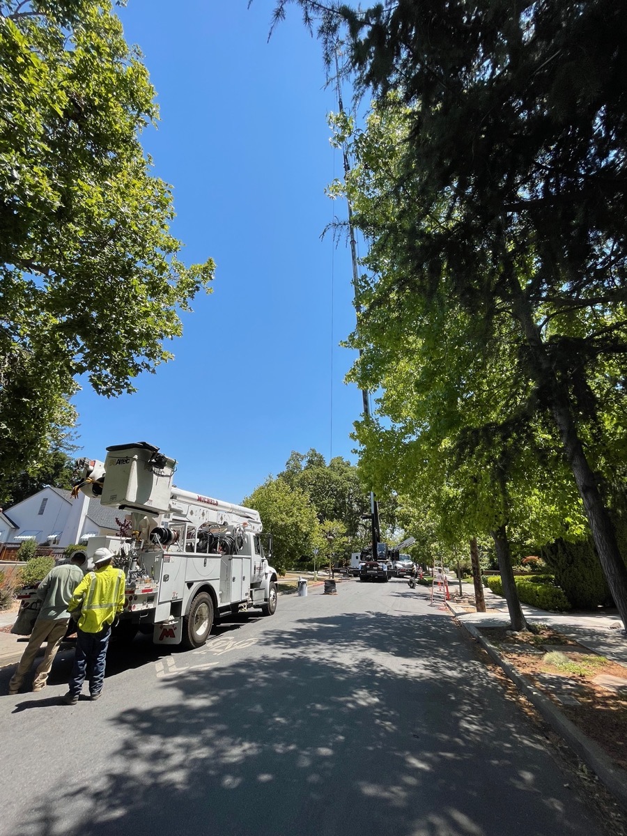 My wife came home from running errands yesterday and quickly dragged me outside (in the heat, which I was doing my best to hide from), to see an incredibly tall crane sticking up from somewhere in the Mount Carmel neighborhood. Although the heat made me somewhat reluctant to go out — I had intentionally taken a walk on Monday, which, as forecast, turned out to be the coolest of our weekdays — my curiosity indeed got the better of me: I just had to go see what was going on. Fortunately the crane wasn’t too far from my home, and I was able to stand in the shade of a mature street tree and watch the going’s on along, it transpired, the 100 block of King Street. PG&E had closed off the entire block and had filled it with a great many trucks of all sorts. The main feature, though, was a crane that seemed almost impossibly tall for something mounted on the back of a truck: