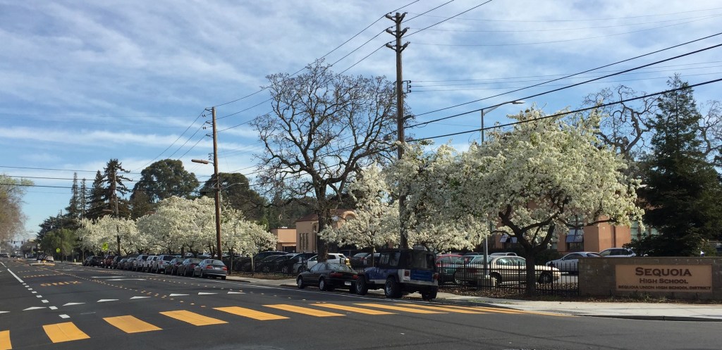 How you define “best,” however, is a topic worthy of discussion. For the last week or so our weather has been amazing: beautiful, sunny days in the mid 70’s. [Remember, I wrote this in February of 2016] But it is mid-February, and we are in the middle of an El Niño; it shouldn’t be this nice! The “best” weather for this time of year ideally should include plenty of (not too heavy) rain, with light winds and some multi-day breaks to let the moisture soak into the soil — the kind of weather we were getting through most of January. The forecasters say that we’ll likely return to a pattern of rainy weather sometime next week and continue all the way through March, so there is still hope. And Mike Nicco of ABC channel 7 tweeted that we’ve often seen a dry spell during even the strongest El Niño years, so I’m guess we need to just enjoy the nice weather while we have it. Which is what the Evergreen Pear trees at Sequoia High School (along Brewster Avenue) seem to be doing: