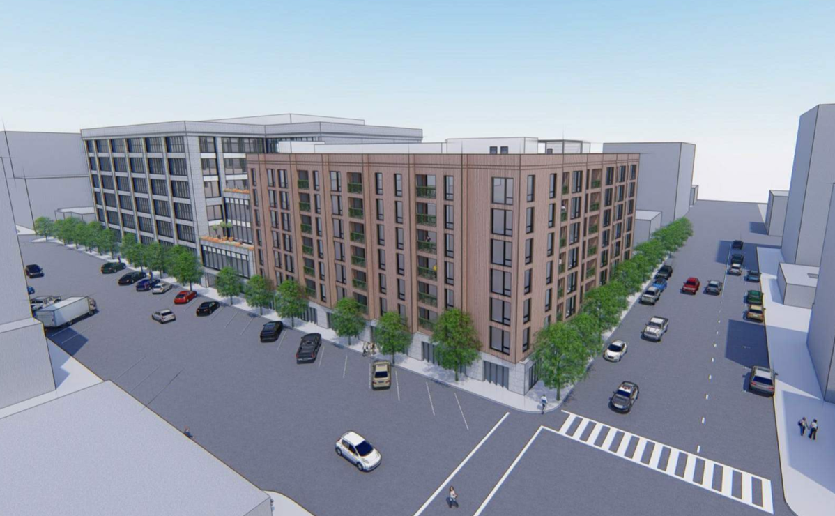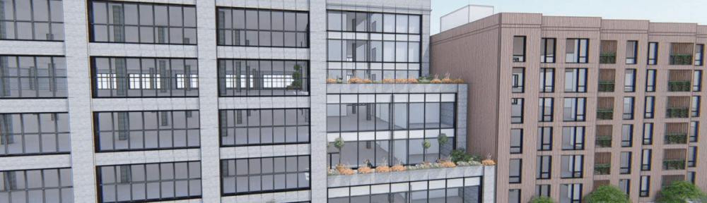 Both buildings are seven stories tall, but as you can see from the rendering each of the residential stories would not be as tall as those in the office building. Thus, the residential building would be somewhat shorter, at 82 feet (not counting the parapet which hides the rooftop mechanical equipment). The office building, on the other hand, would be 101 feet tall, plus its parapet. As for the stepped portion in the middle, because it is part of the office building it would extend to the building’s full height towards the back. However, its “steps,” which would be on the third and fifth floors, would be outdoor terraces for those in the offices.