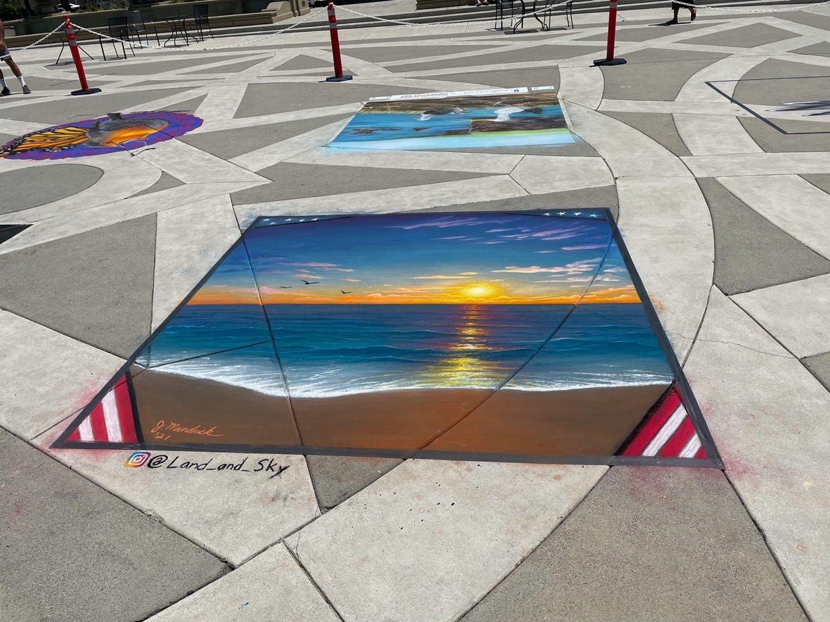 Redwood City seems to have gotten through the Fourth of July holiday relatively unscathed, although my wife and I certainly heard a lot of fireworks being shot off that night — plus many nights before it, and a few after. Over the weekend I did go down and check out the Chalk Art Walk as planned. There were some terrific works of art to look at, some that I found hard to believe were done entirely in chalk. For instance, this one, which was in Courthouse Square, was incredibly realistic: