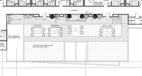 I mentioned that all of these decks are on the second floor (and are only associated with five units on that floor). The units on the third and fourth floors don’t have private decks, allowing the sun to (when it is in just the right position) reach down to the second floor decks. So what are the residents of the remaining floors (and the one unit on the second floor that doesn’t have a deck) to do? Well, there is a relatively large “common deck” on the fourth floor. It looks out over Hemlock Avenue, and sits atop those two white projections I referred you to earlier. Here is the layout of that deck on the plans: