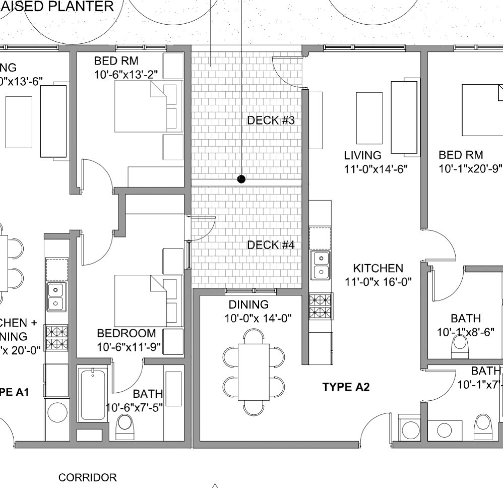I mentioned that all of these decks are on the second floor (and are only associated with five units on that floor). The units on the third and fourth floors don’t have private decks, allowing the sun to (when it is in just the right position) reach down to the second floor decks. So what are the residents of the remaining floors (and the one unit on the second floor that doesn’t have a deck) to do? Well, there is a relatively large “common deck” on the fourth floor. It looks out over Hemlock Avenue, and sits atop those two white projections I referred you to earlier. Here is the layout of that deck on the plans: