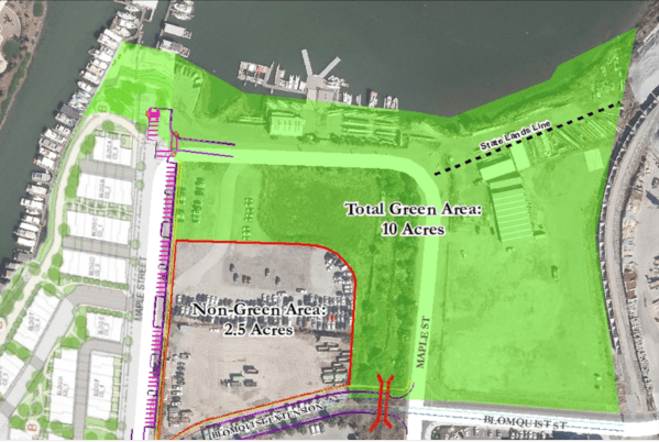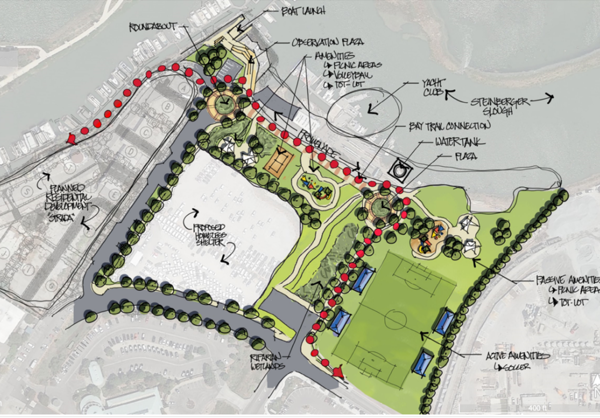 Before I leave the above drawing, note the red dotted pathway. The developer of the 1548 Maple townhouse project is already on the hook to provide a public path running along Redwood Creek, from the Bridge to Nowhere out to the tip of their property. Whomever drew the park plan then presumed — most logically — that this path, which would be a key missing part of the San Francisco Bay Trail, would then run through the park and out to Blomquist Street. Hikers along the trail would follow Blomquist Street out to Seaport Boulevard, where a segment of the trail already exists that runs out to the Pacific Shores complex at the end of Seaport Boulevard.