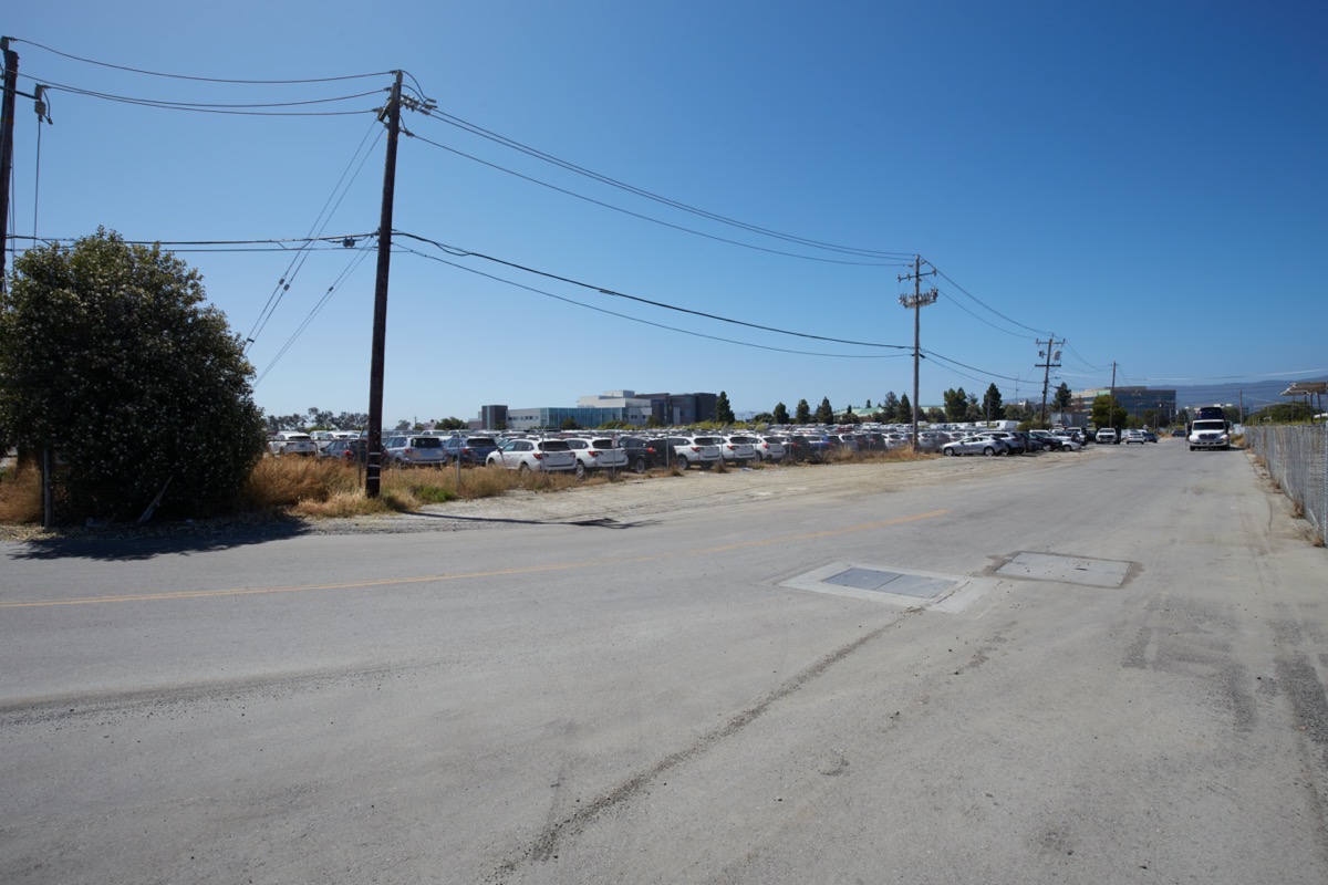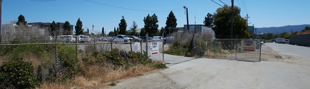 (I took this picture back in 2018, from the bend in the “U”, looking back along Maple Street towards the Redwood City Police Station.) Nowadays, most of the land sits empty; the city has been working with the various dealerships, helping them find other places to locate their vehicles. The last time I was there, Towne Ford still had a small operation out there, with what appears to be a small portable office and the various trucks and vans that make up their fleet sales arm: