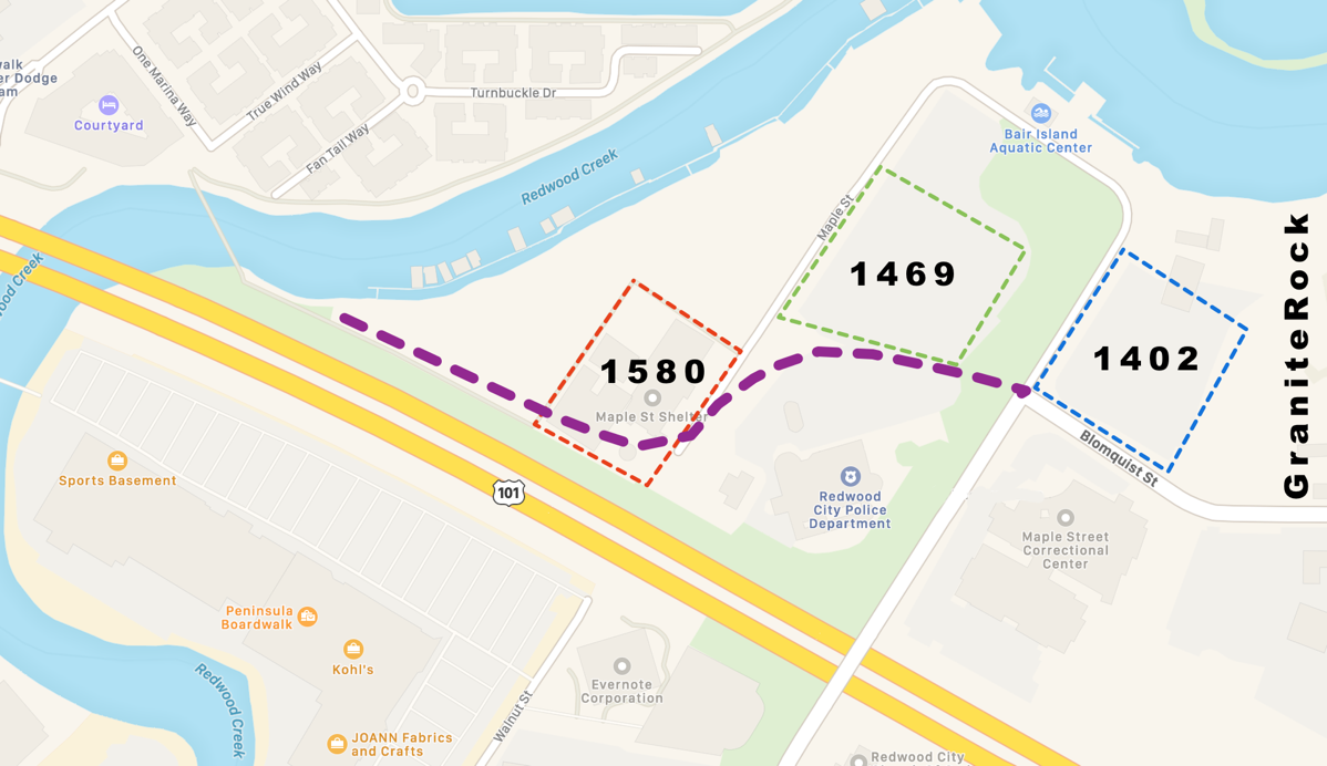 • 1580 Maple: currently home to the LifeMoves Maple Street Shelter, and former home of the women’s jail. This parcel is owned by the County of San Mateo.