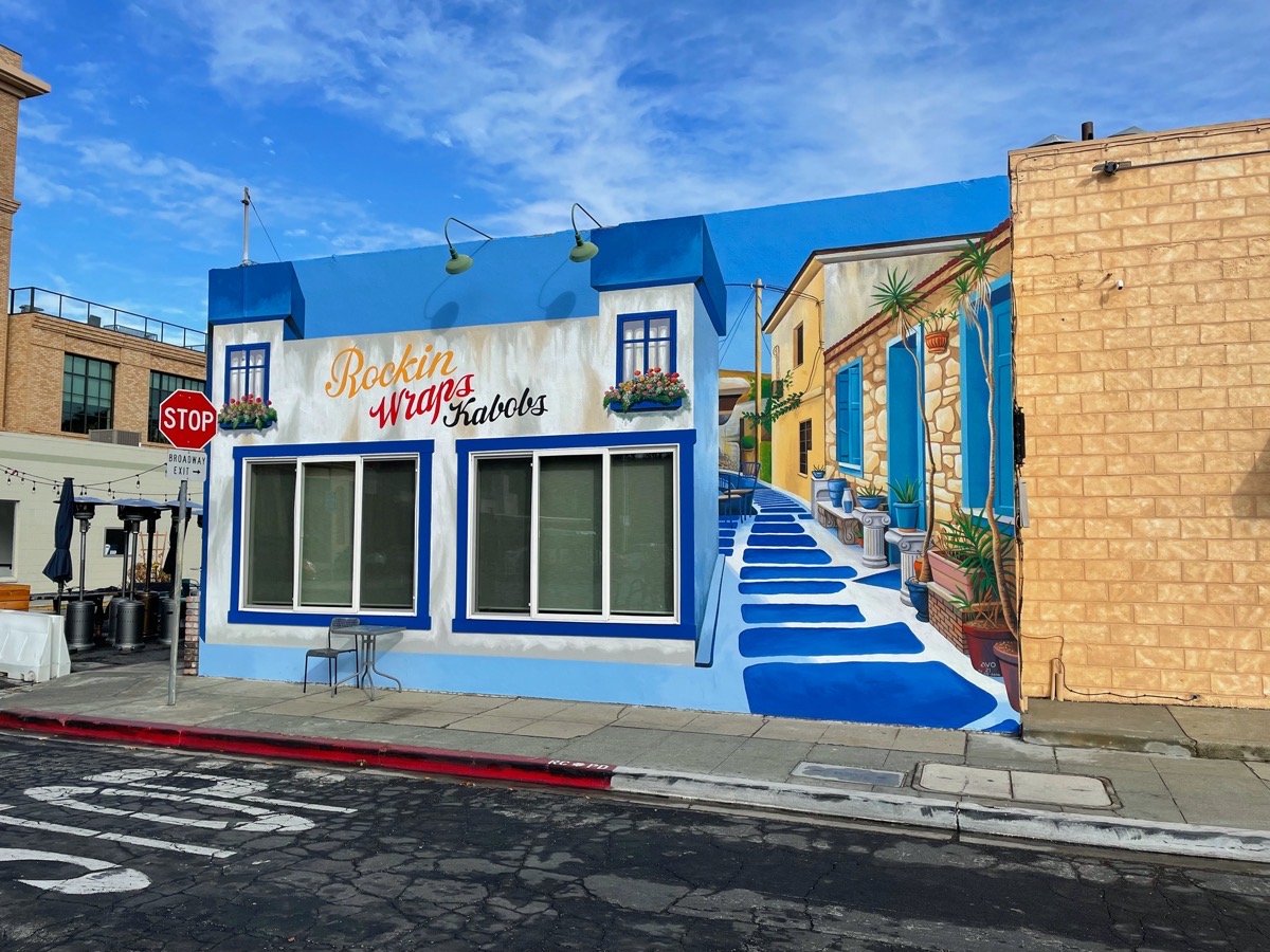 I say “public” because it is intended for all of us to enjoy (I took this picture while standing in the Main Street parking lot, just in from Broadway), although I’m sure that it was done at the behest of Rockn Wraps Kabobs [curiously, the mural calls it “Rockin Wraps Kabobs,” with an “i” in “Rockin” — but the business name uses “Rockn”], which of course is located within this building. While this mural is most likely intended primarily to call attention to their business, they did a terrific job. I love how they created a fake alleyway between their building and the one next door (home to Studio S, a dance studio); I want to walk down that walkway. And their clever use of a fake blue sky makes the Rockn Wraps building look shorter, and more interesting, than it actually is. Perhaps this will inspire the owner of the building just past Studio S where Zareen’s is located to do something similar; their back wall is just dying for a mural, don’t you think?
