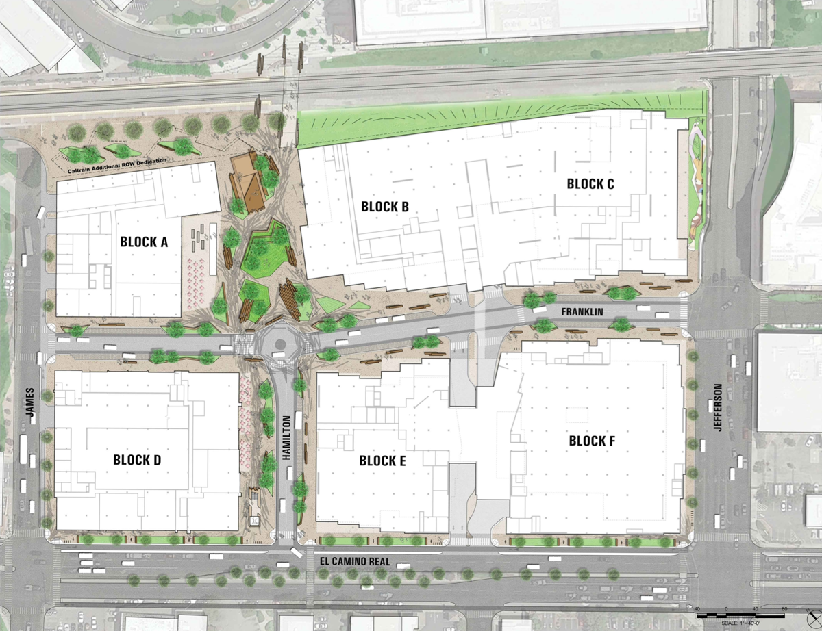 Quite a change, isn’t it? Anyway, El Camino Real is the street in front, with the trees along it. James Avenue runs along the left side of the six-building development, and Jefferson Avenue runs along the right side. Caltrain, of course, would run behind all of this and, as usual, separate the Sequoia Station property from downtown Redwood City.