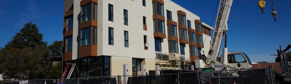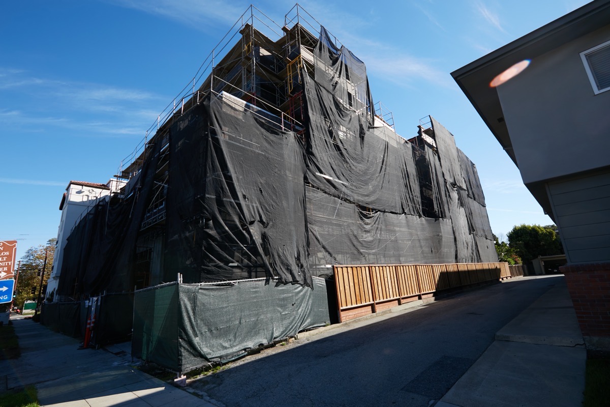 Over behind the Bianchini’s Market, at the corner of Walnut and Olive streets, the 24-unit Walnut Studios apartment building is rapidly nearing completion. This building, which will contain 23 affordable studio units and one market-rate unit for an onsite staff member, replaced a two-story, six-unit affordable building.