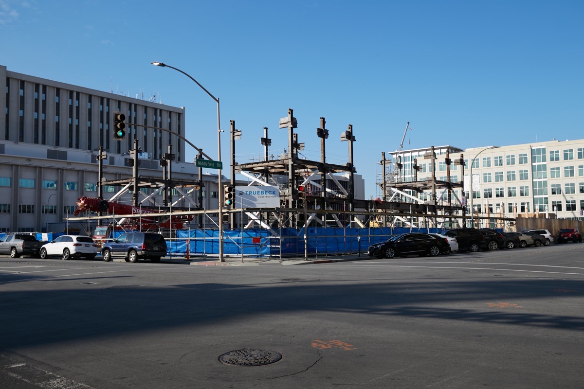 One site that regular readers know I regularly shine a light on is the parcel along Marshall Street upon which the county is in the process of erecting its “County Office Building #3” (COB 3, for short). When I previously reported on this project, two of the metal tower-like structures had been erected; now, there are four (only three of which are clearly visible in this particular photo):