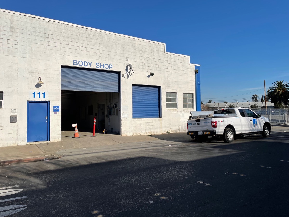 With Towne Ford having vacated their El Camino location, the developer of the South Main Mixed-Use/ELCO Yards project is wasting no time getting that enormous project underway. Although it doesn’t appear that demolition permits have yet to be issued (at least, they aren’t showing as having been issued on the city’s website), permit approval may well be imminent: construction fences have gone up around most if not all of the buildings on the six blocks that make up the project site, and today I saw PG&E disconnecting those buildings from power.