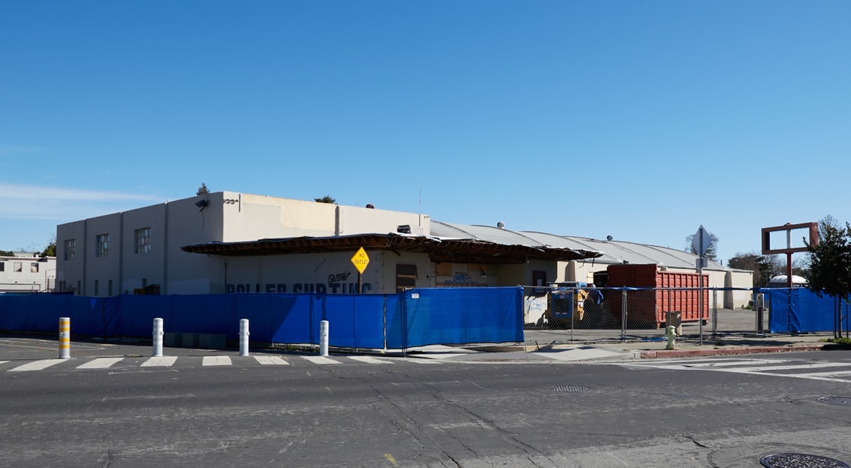 On one of the other project parcels, some bits of the Redwood Roller Rink building (the rink having been closed years ago) have been removed. In particular, the sign that had been affixed to the building, and the leading edge of the entrance overhang have both been removed: