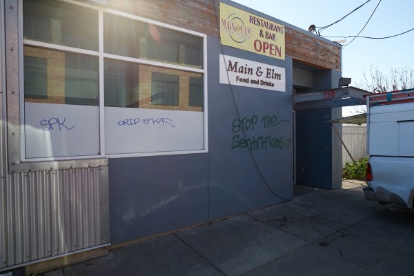 At yet another location on the project site, the Main & Elm restaurant has closed, and this week I observed people on that building’s roof doing work of some sort. They may well have been disconnecting power from the building; it likely will be torn down soon as well. For those who’ve enjoyed the Main & Elm restaurant, the plan is for a new incarnation of that restaurant, likely with a new name (since it will no longer be located near the intersection of Main and Elm streets) to open in the rebuilt “Perry Feeds” shed at Chestnut and Spring streets. However, it should be a couple of years before the recreated shed is suitable for occupancy, so you’ll need to be patient. Oh, and don’t let the “Open” sign on the existing Main & Elm building fool you; the graffiti (which hopefully won’t be there for long) should be your clue that Main & Elm is not longer open and serving: