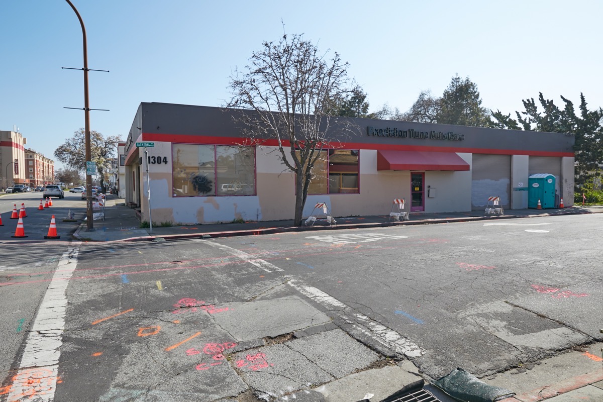 Note the cones on El Camino Real (against the left edge of the photograph) and the construction easels along Jackson Avenue. According to signs on those easels, work will take place on this site from Monday, February 7 through the end of March. That initial work may just be limited to utility work beneath the two streets bordering this building — many, many spots on the street have been marked — but demolition will surely take place soon (here, too, a demo permit has been applied for, but not yet granted). I should note that one permit that has been issued for this site is for a temporary power pole, which is often the first step of a new construction project.