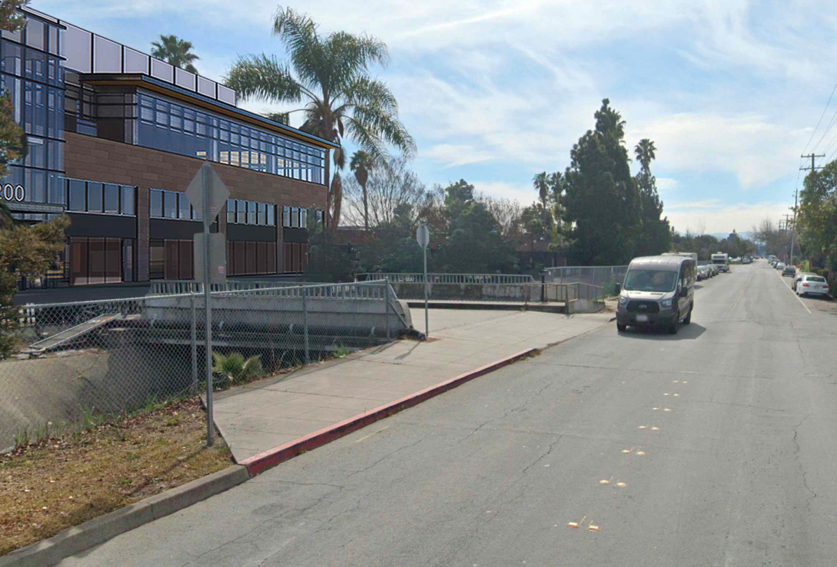 Being completely surrounded by roads, a somewhat taller building on this site won’t have much impact on its surrounding neighbors. There are houses along this part of Marsh Road — they were right behind me as I took the above picture — but as you can see they are a fair distance from the office building. Really, the only impact will likely come from an increase in the amount of traffic making its way to and from this building. All vehicular access will use the bridge that currently spans the Marsh Creek channel, which lines up with Hoover Street (as you can see if you look closely at the map shown earlier, the driveway and bridge are represented by a faint gray line that looks like an extension to Hoover Street — which otherwise dead-ends into Marsh Road — and leads to the existing parking lot). This is that bridge today: