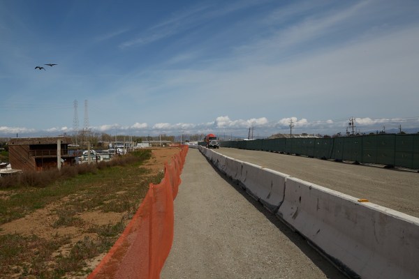 As will undoubtedly become a regular thing for me, I again this week walked over to the bay side of the freeway in order to check on the progress of the two substantial projects being built over there. I was surprised to see that the portion of Maple Street leading from the Docktown Marina parking lot to where Maple Street dead-ends into the highway (behind the police station, at the LifeMoves shelter) has been closed off, and that a temporary road has been constructed through the middle of the 1548 Maple Street project parcel to provide access for both the shelter and the Silicon Valley Clean Water pumping station (which is in the process of being completely rebuilt). This temporary road is quite impressive. While I was there it was being used by a variety of vehicles, including cement mixers heading to the pumping station project. I was pleased to see that a wide bicycle/pedestrian pathway was also constructed alongside this temporary road, with concrete barriers providing some protection from the cars driving by: