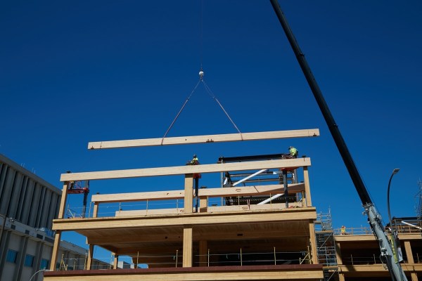 Assembled is not a word I would normally use to describe the construction of an office building, but as you can probably tell just by driving by, this is no ordinary office building. County Office Building #3 (COB-3 for short) was designed and is being built using mass timber construction, a technique in which the building’s primary load-bearing structure is made of wood. This type of construction has many benefits, one of which being that each piece is precision cut and shaped off-site. Those pieces are then trucked to the site and assembled, unaltered. This means that construction goes quickly, since there is no need to measure and cut the pieces on site. The wood pieces — beams, floor panels, and the like — are even pre-drilled for pipes and wires, speeding up the installation of the building’s plumbing and electrical. And although metal brackets are being used to fasten the wooden pieces to one another, the beams have also been pre-slotted to accommodate those brackets.