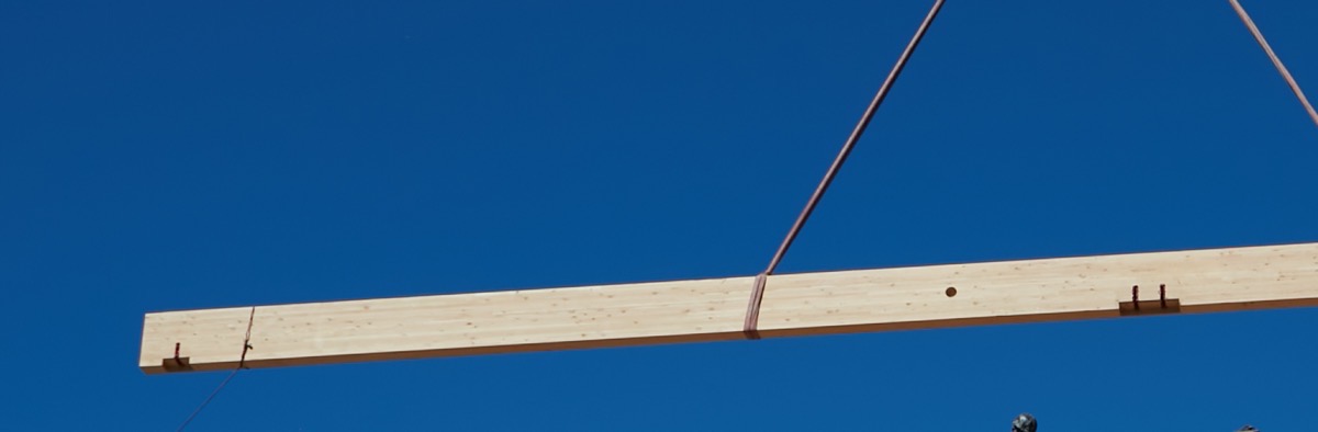 Wood being wood, of course, it is affected by moisture and temperature; sometimes the assembly process needs a bit of help. That was the case with this particular beam, which turned out to be a tight fit. The workers that were putting it into place ended up having to employ a scrap piece of 2×4 in order to coax it into place: