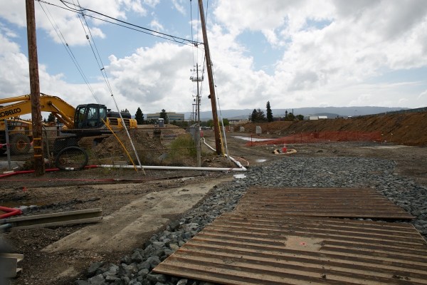 Moving on from hotel news, although actual construction of the county’s Navigation Center east of Highway 101 has yet to get underway (it will, though, very soon), there are signs of preparatory work taking place between that property and the one that will host the 1548 Maple Street townhouse complex project. The portion of Maple Street between the two has been abandoned, as I’ve noted previously, but now there are some cylindrical concrete pieces standing along where the street used to be that appear to be the vertical shafts that lie beneath manhole covers. And there is a temporary pipe running alongside the county parcel that may be draining water from their site. These things are new since I was last there, so work on one or both projects is continuing…