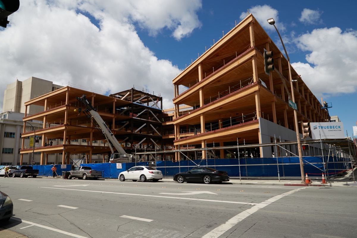 Work on the mostly wooden “County Office Building #3” (they really need to give this thing a catchier name) on Marshall Street continues apace. Not only has the building gained a fourth story (one more to go), but note what appears to be a concrete facade on the building’s Middlefield Road face on the ground floor (along the right side):