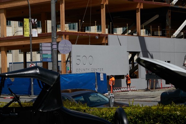 This new building should be a nice companion to the existing History Museum (in the old county courthouse, the dome of which you can see looming over the new museum in the above rendering) and the Lathrop house, which you can see to the right of the new museum in the rendering. The classic styles represented by all three buildings will make for an interesting contrast with the five-story wooden “County Office Building #3” (COB-3) actively under construction just across Marshall Street. Of all the pictures I took that morning, my favorite came about when the sign for the new museum was about to be unveiled: a number of workers on the COB-3 project, who up until that point had been contributing to the din that made it difficult to hear a number of the speakers, paused to see what we were all up to: