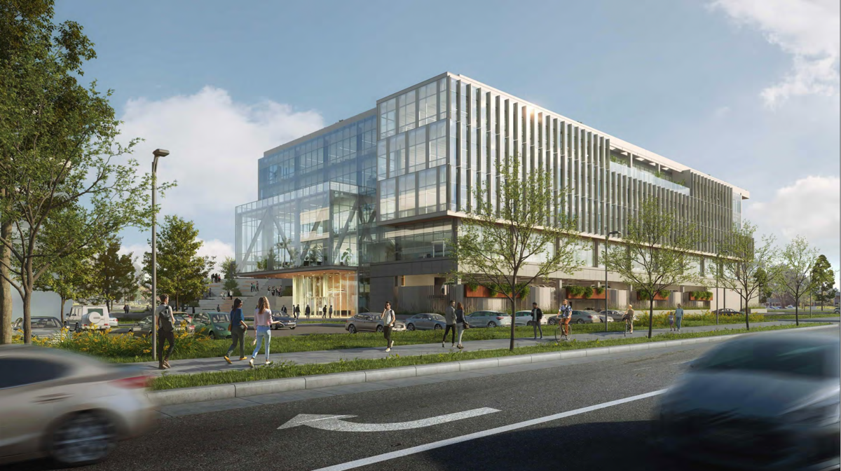 a “five-story”, (maximum building height of 87′) life sciences building including approximately 197,763 sq. ft. of office and research/development uses, and a two-story parking podium containing 415 parking spaces, which will utilize a valet-assisted parking program. An additional 225 surface parking spaces are to be provided onsite as well.