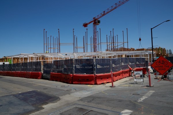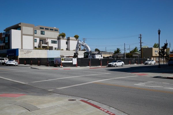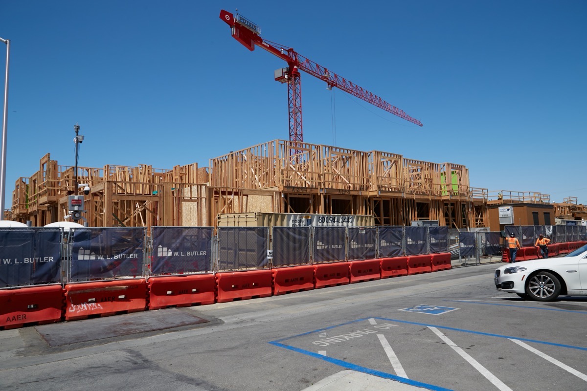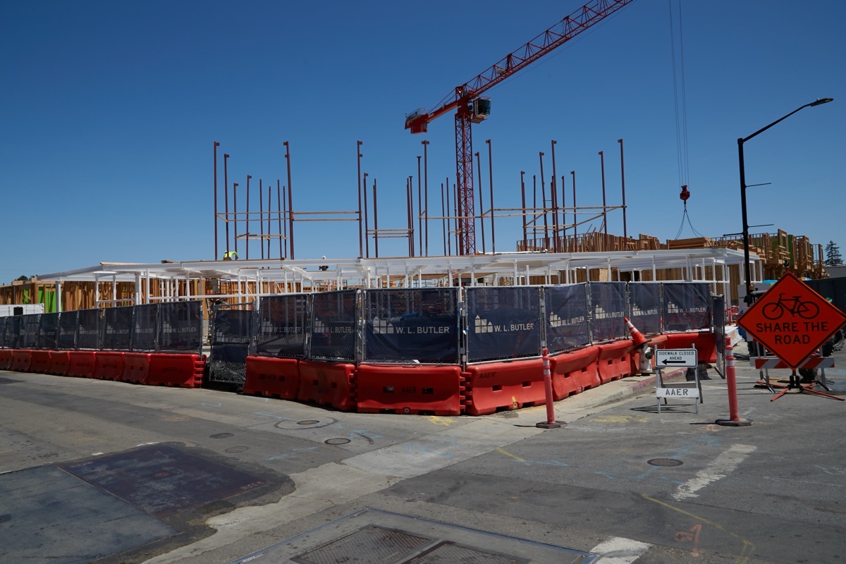 Directly across the Caltrain tracks — and somewhat visible from where I took the above pictures, even given that the tracks are raised up on an earthen berm through Belmont — is the Firehouse Square project. The main portion of that project — the multi-story building at the corner of El Camino Real and O’Neill Avenue that will contain 66 affordable apartments and 3,750 square feet of commercial space — looks to be nearly complete. Construction activity already appears to be shifting to the project’s 15 market-rate townhouses that will be constructed on Fifth Avenue. In any case, here is what the project looks like today when viewed from El Camino Real: