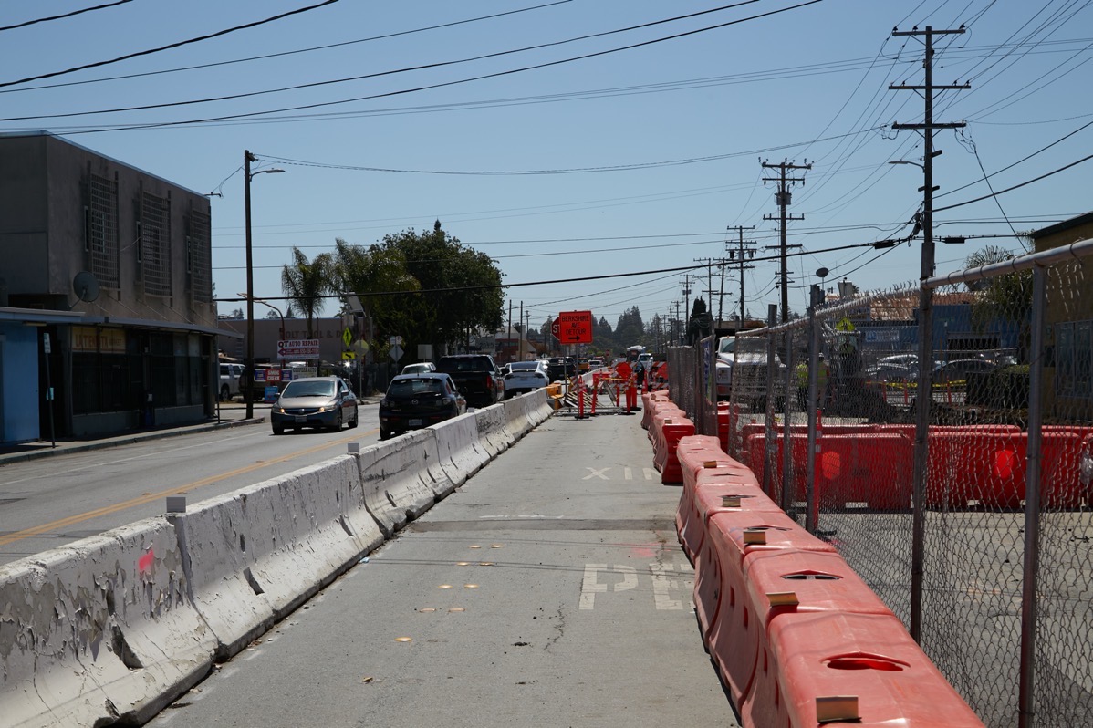Fortunately for both pedestrians and cyclists, a temporary lane has been set aside down the center of Middlefield Road for them using both plastic and concrete barriers: