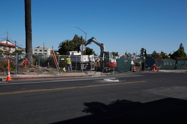 These days I’m visiting the ELCO Yards project site on a weekly basis; there is so much going on there right now! On the site of the project’s “building B” — the four-story office/retail building being constructed where Towne Ford’s dealership building used to be — digging has begun, likely for the building’s underground parking garage. This week I spent more time, though, on the site of building E, at the corner of Main and Chestnut streets — where the metal Perry Feeds shed stood until recently. The small bit of Shasta Street between Chestnut and Main that ran in front of the shed is being abandoned and absorbed into the building E site; it has now been fenced off, and work is going on behind those fences: