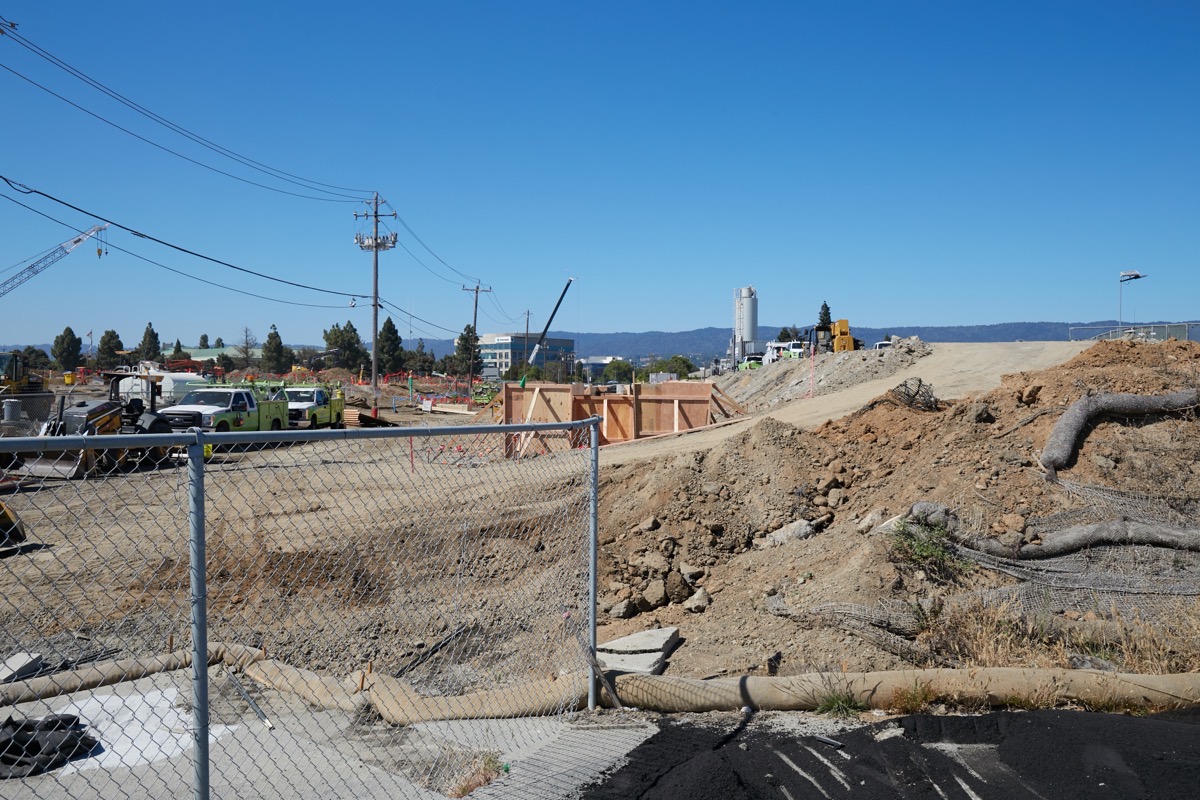 As for the county’s navigation center site, there is a lot of construction activity happening on the site right now, but little of interest to photograph: so far the work seems confined to running utilities and preparing the ground for the pre-fab buildings that will soon make up the development. Of more interest to me at the moment, though, is the related project (actually being done on behalf of the city by the developer of the 1548 Maple Street project, I believe) to extend Blomquist Street around and behind the Redwood City Police Department offices. That extension will be the means by which people will ultimately access the county’s navigation center, now that the section of Maple Street by which you used to access the site is gone (the property’s address is, or was, 1469 Maple Street). The first part of that extension, from where Blomquist Street currently dead-ends into Maple Street (Maple previously made a “U”; only one leg of the “U” has been eliminated) will begin with a bridge across a small canal, and that is where a lot of the visible progress is currently being made: