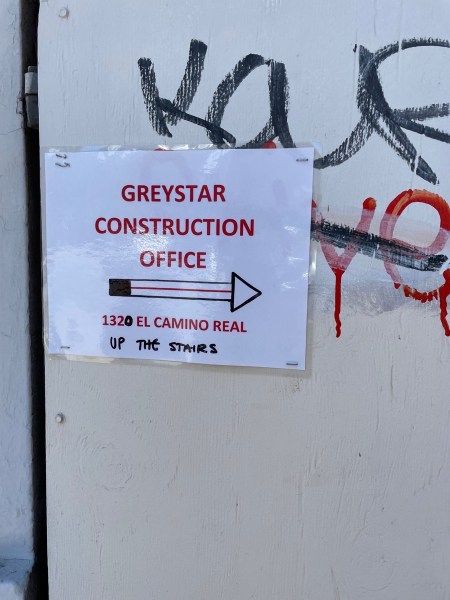 On a previous visit I had noticed that the second story of the Record man building, which had been damaged in a fire some months ago, had been repaired. I’m now guessing that the repairs were carried out by Greystar, who currently has their construction office (for the 1304 El Camino Real project, at any rate) located up the outside stairs: