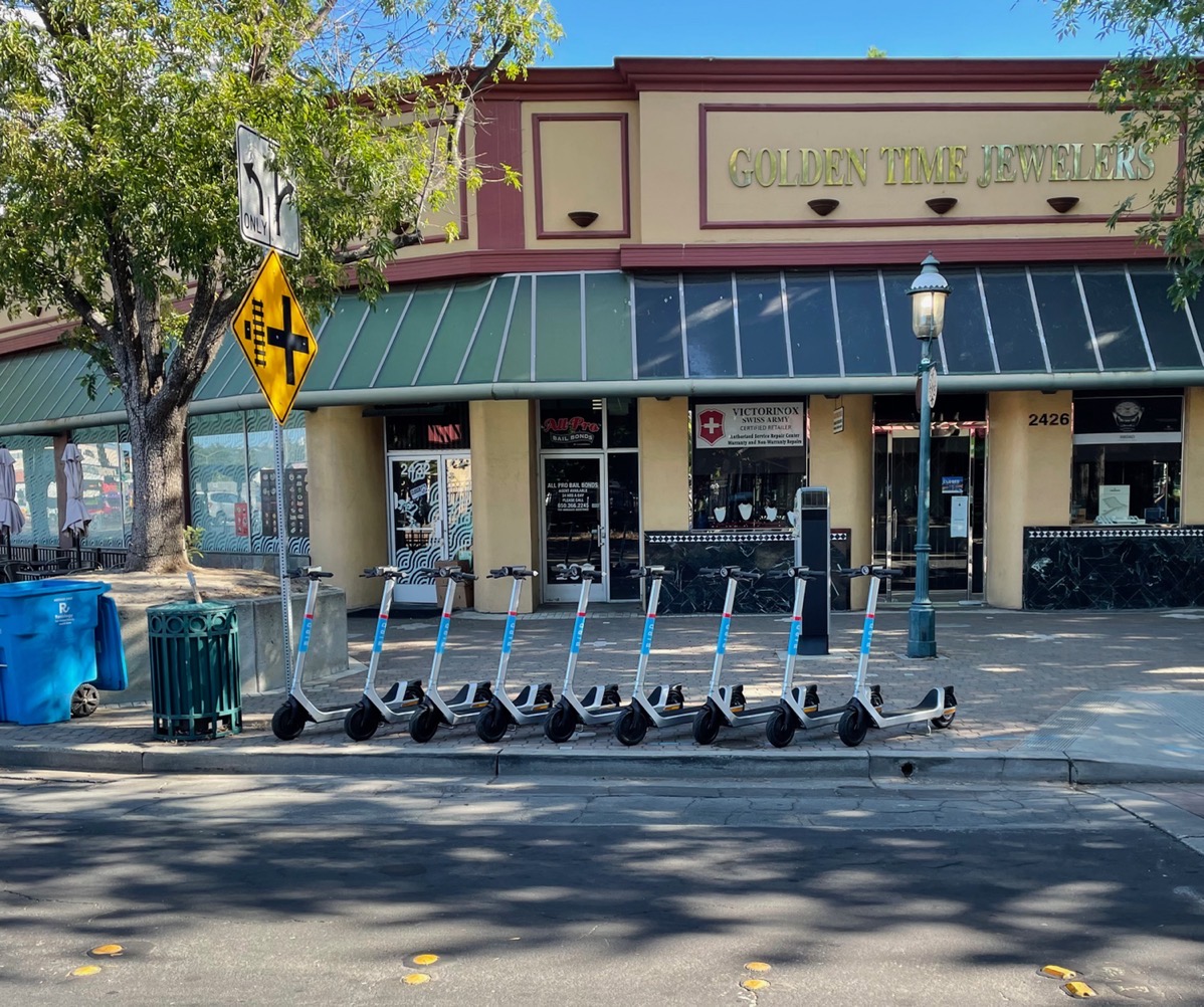 Yes, the scooters have arrived. Back in September, the Redwood City Council held one of its study sessions on shared micromobility services (scooters and e-bikes, most commonly). Then, in October, it adopted an ordinance altering Redwood City’s Municipal Code to enable shared micromobility service providers to apply for a permit to operate within the city. Today, those ordinance changes were made concrete in the form of dozens and dozens of Bird scooters being deposited throughout downtown. The above picture shows just one such cluster (“flock”?) of Bird scooters near the city’s Caltrain station, but you’ll find them on a variety of street corners throughout Redwood City’s downtown (and possibly elsewhere).