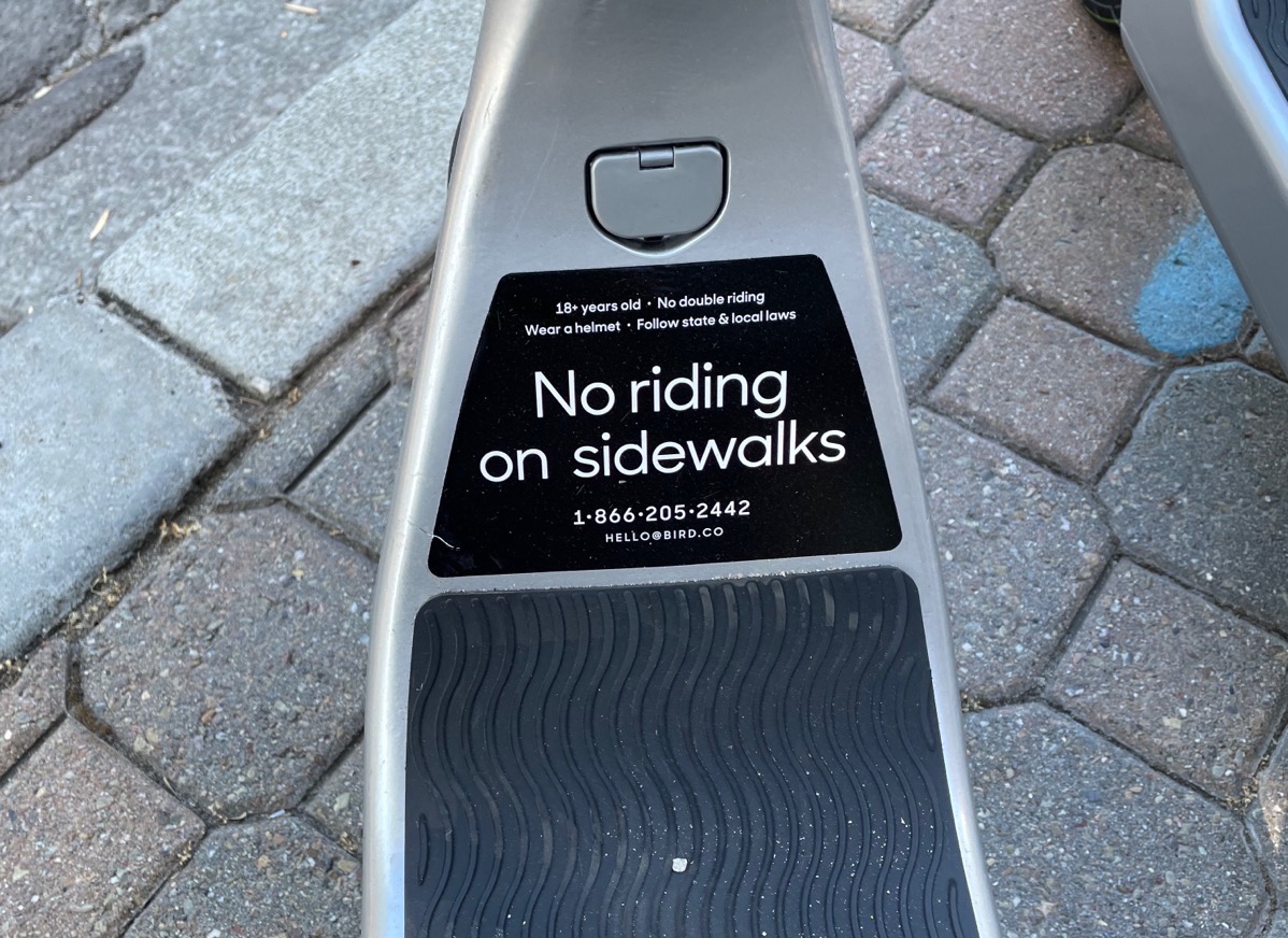 Each scooter has a sticker that clearly says “no riding on sidewalks” — along with, in much smaller print, “18+ years old,” “no double riding,” “wear a helmet,” and “follow state and local laws.” Based on what I saw in D.C., except for the last one (which I couldn’t fairly judge, since I don’t know the local laws of Washington D.C.), countless people were breaking each of the other rules. Although I’d like to think that things will go better here, based on what I saw this morning, we’re not off to a good start. In the space of about two minutes, as I was taking these photographs, I first saw someone go whizzing along the northbound Caltrain platform on a Bird scooter, after which someone zipped by on the sidewalk, coming within inches of my face. Naturally, neither rider was wearing a helmet. To their credit, they did appear to be over 18, and I didn’t (yet) see any double-riding. However, I can almost bet that I’ll see both of those rules being broken the next time I’m walking downtown. My primary concern, though, is the rule about sidewalks: it is illegal to ride these things (or bikes) on the sidewalk in Redwood City. They are allowed in the bike lanes, though.