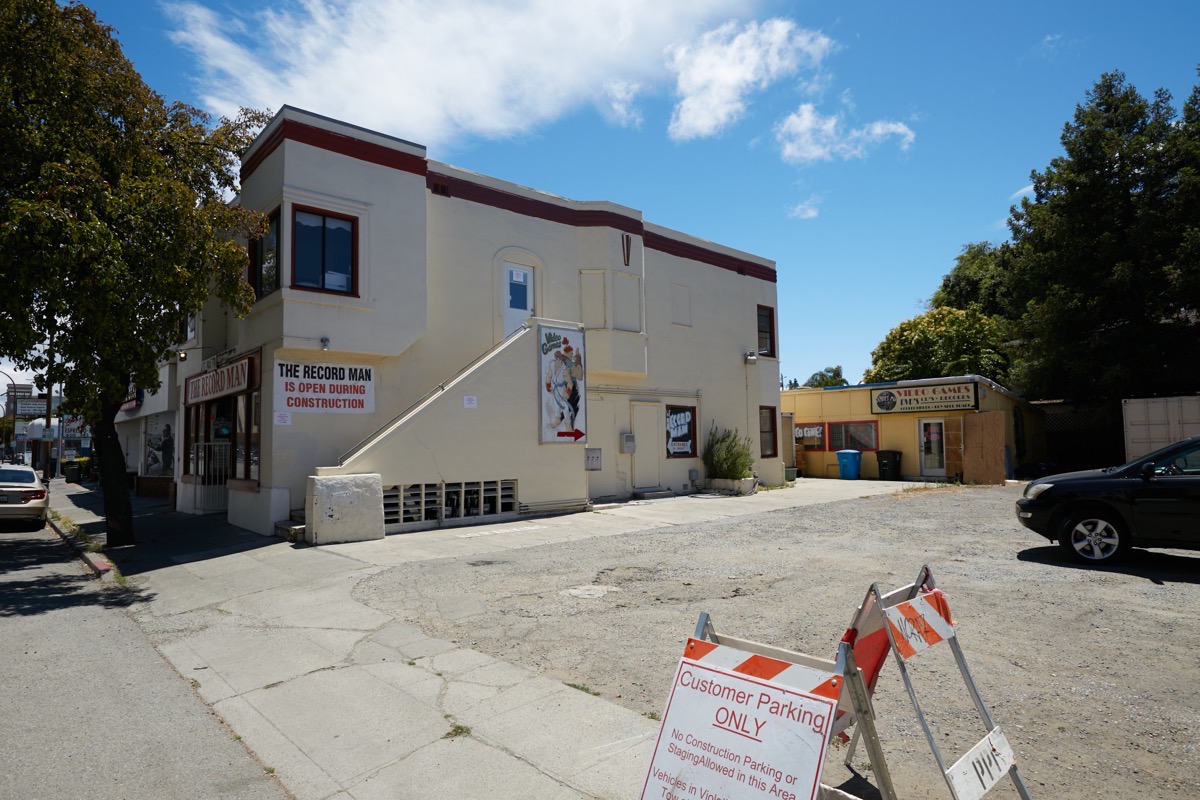 I next wandered up El Camino Real to check on the progress of the six-story affordable apartment building being constructed as part of the ELCO Yards project. Although there is little new to report on that building at the moment, I did notice one interesting thing. Affixed to the side of the next-door Record Man building was this sign: