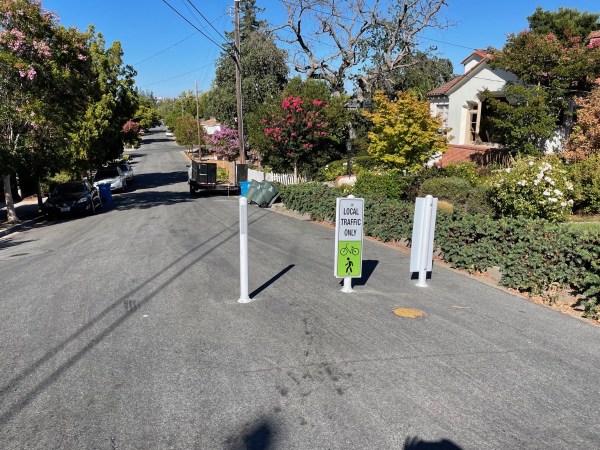 As you can see, these new signs and posts more effectively block the lane than the temporary signs did. The above picture shows Katherine Avenue as viewed from Nevada Street, but I’ve seen similar installations in various parts of the city. Just today, in fact, while making deliveries for Meals on Wheels, I encountered one such “Local Traffic Only” zone, on Page Street down by Marsh Avenue. I actually paused and gave a moment’s thought as to whether I really needed to enter the local traffic zone, which of course is the point of these signs. In today’s case, I did, but I will continue to avoid them whenever possible while driving — just as I’ll continue to favor them while walking.