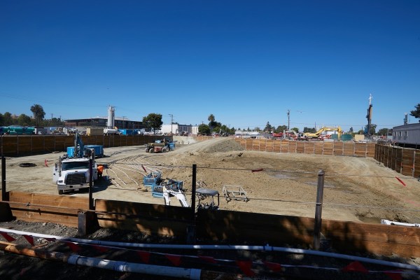 To see what I saw, head down to parcel E, which sits between Main Street and the Caltrain tracks, and extends from Chestnut Street to the Main Street Dog Agility Park. There they are using a very tall piece of equipment (just visible in the distance toward the right edge of the above photo) to insert the I-beams. But rather than pounding the beams into the ground, this thing uses a giant hydraulic ram to press down — very firmly, and very slowly — on the beam, thereby shoving it into the ground. To help the beam deal with recalcitrant soils, a high-pressure jet of water is directed to the base of the beam; this water jet not only creates a pilot hole, but also keeps things lubricated, lowering the friction between the sides of the beam and the surrounding soil.