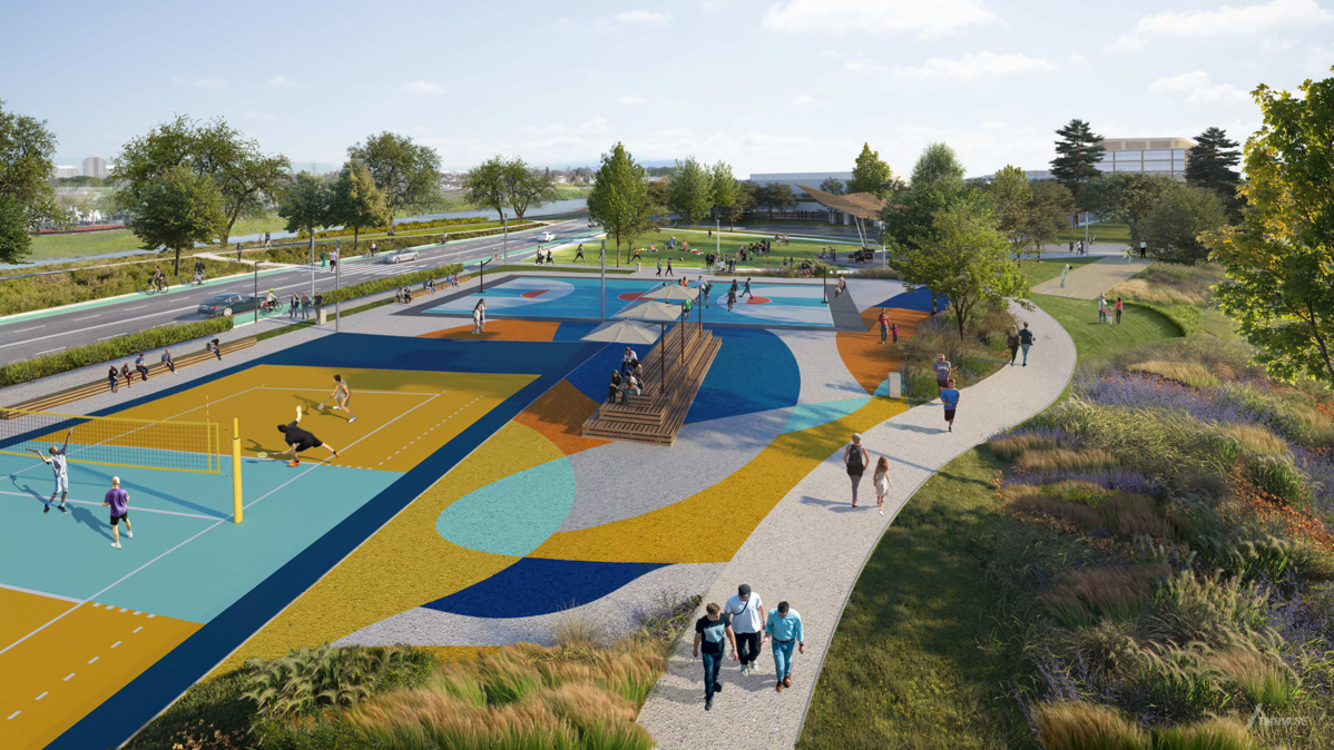Note the smaller square white buildings around the three new ones; those existing buildings would be replaced in later phases. This first phase would consist of two of the development’s office buildings (visible in the foreground) plus the much smaller “Amenity and Community Center” (between and behind the two office buildings). In this phase, a 2.2-acre recreation area along Bridge Parkway would also be constructed, which would look something like this: