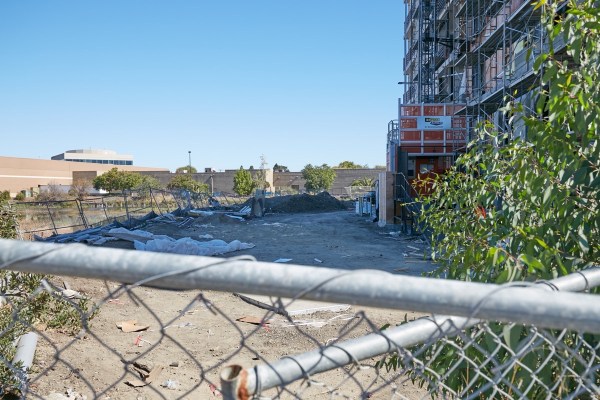 Personally, I’m waiting for the landscaping to be installed. The rear of this building lies along Redwood Creek, and one of the final stages for this building is to install the public path — part of the Redwood Creek trail that currently runs behind the Township Apartments building you can just see along the left edge of the above picture — between this new building and the creek. This week I walked back to the Township segment of the trail, and peeked over the fence into the area where that new bit of trail will run. For now, of course, it is just dirt: