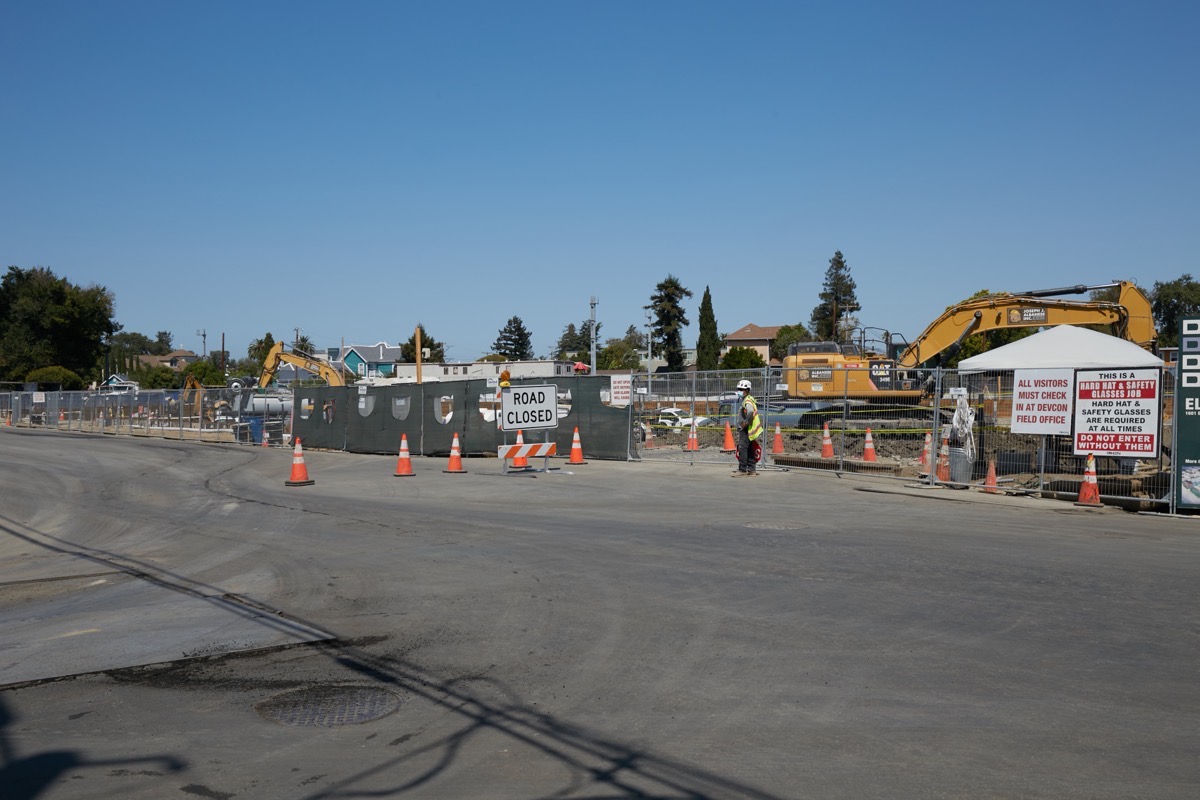 The other portion of the ELCO Yards project that is currently seeing a great deal of activity is the large “parcel E” that sits between Main Street and the Caltrain tracks, and extends from the Main Street Dog Agility Park to Chestnut Street. The metal I-beams that will form the supporting walls of the large two-level underground garage here are apparently all in place: digging for that garage is proceeding in earnest. When I was there I observed a steady stream of empty dump trucks approaching the site, and another stream of full dump trucks leaving the site. In order to facilitate all of this activity, the portion of Main Street fronting this building is temporarily closed, as you can see in the above picture.