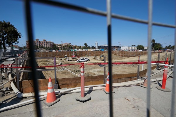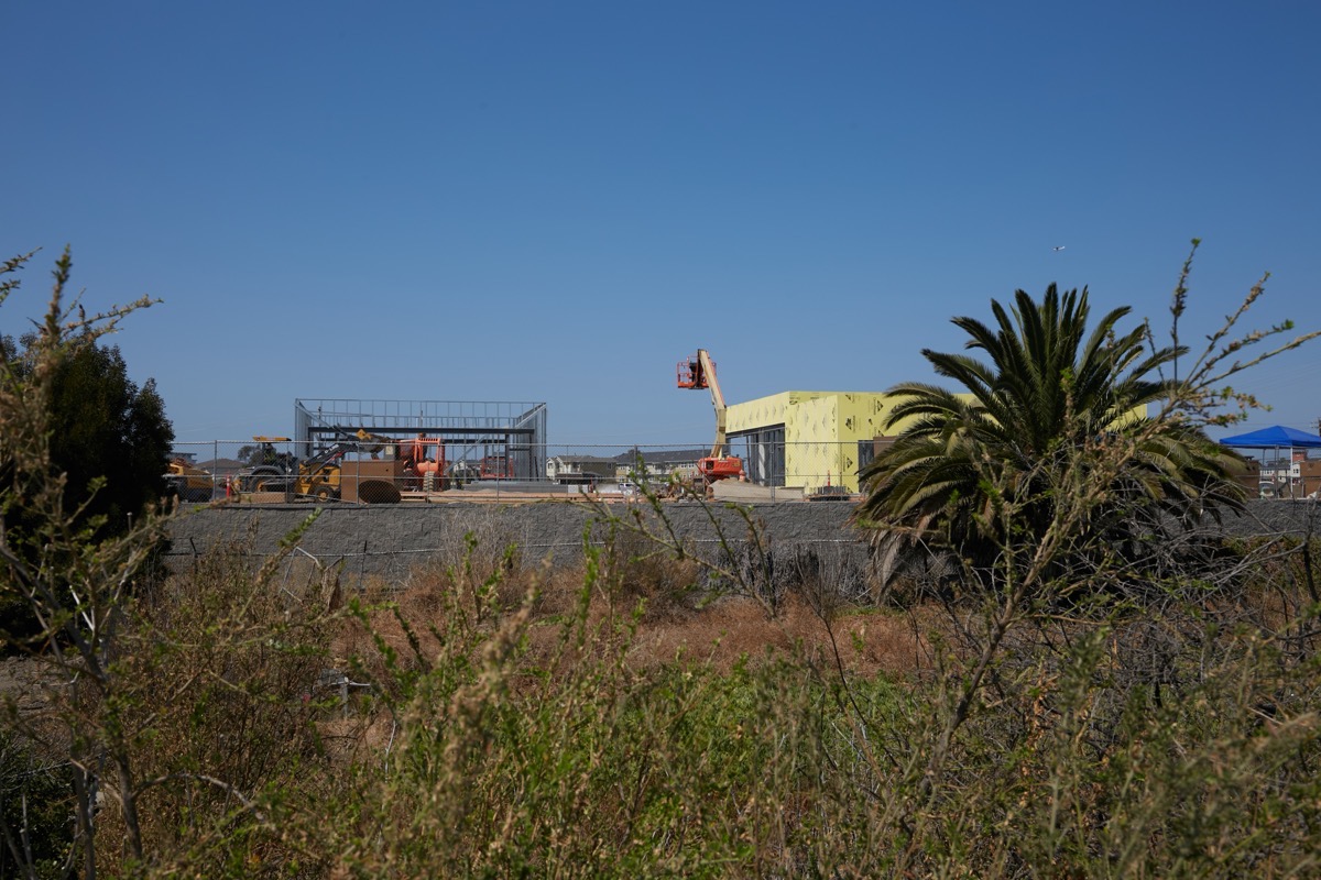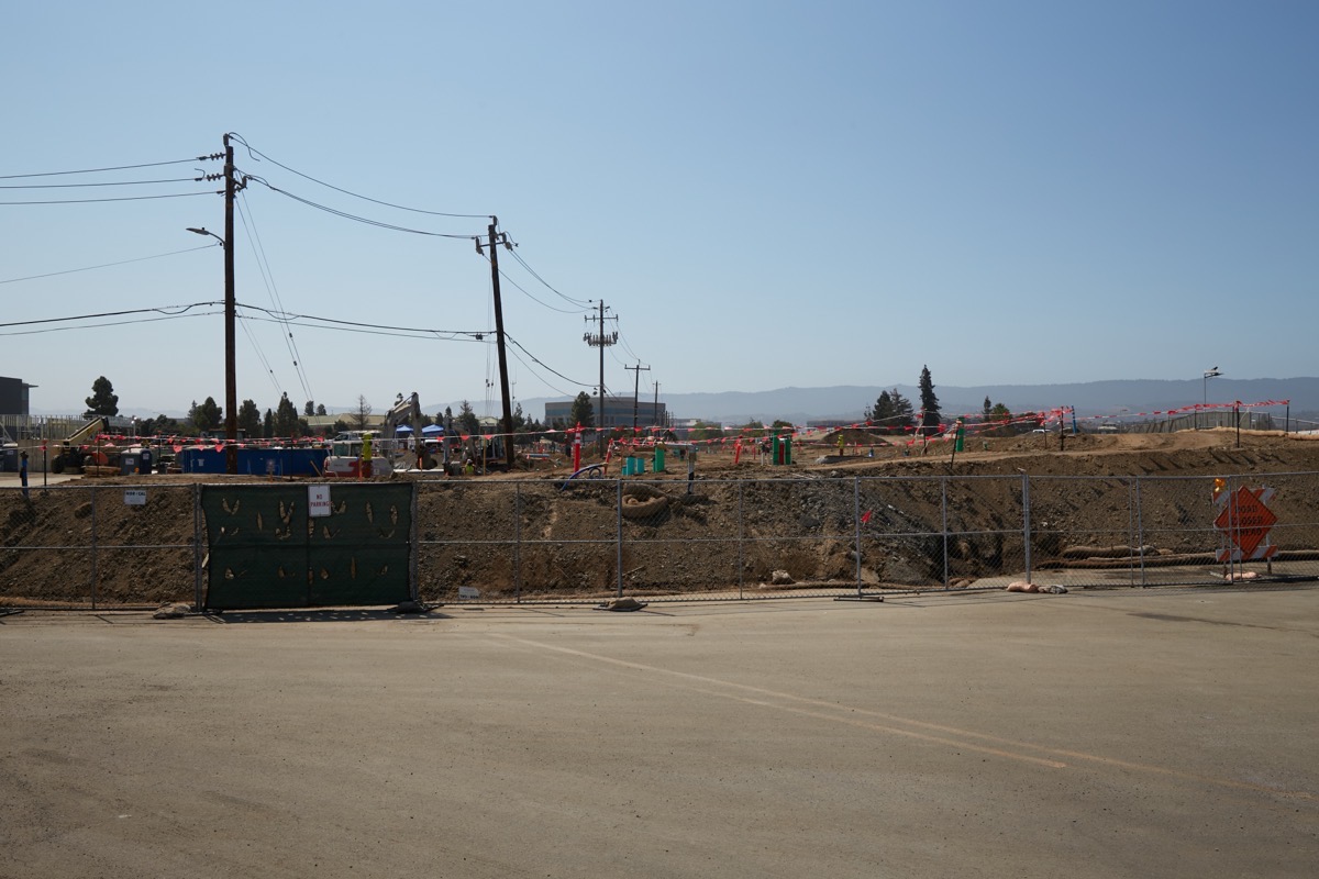 This is a picture of the 1548 Maple Street project. It may not look like much at the moment, but there is a great deal of infrastructure work that had to be completed before construction of the 131 townhomes gets underway. If you look closely you can see a lot of fire hydrants, sewer pipes, and other conduits sticking up from the raised site. At some point, I believe that the wires currently strung between the telephone poles will be undergrounded, and the poles removed. For now, though, those poles roughly mark the boundary between the 1548 Maple Street project and the site of the county’s Navigation Center (which is beyond the left edge of the above photograph).