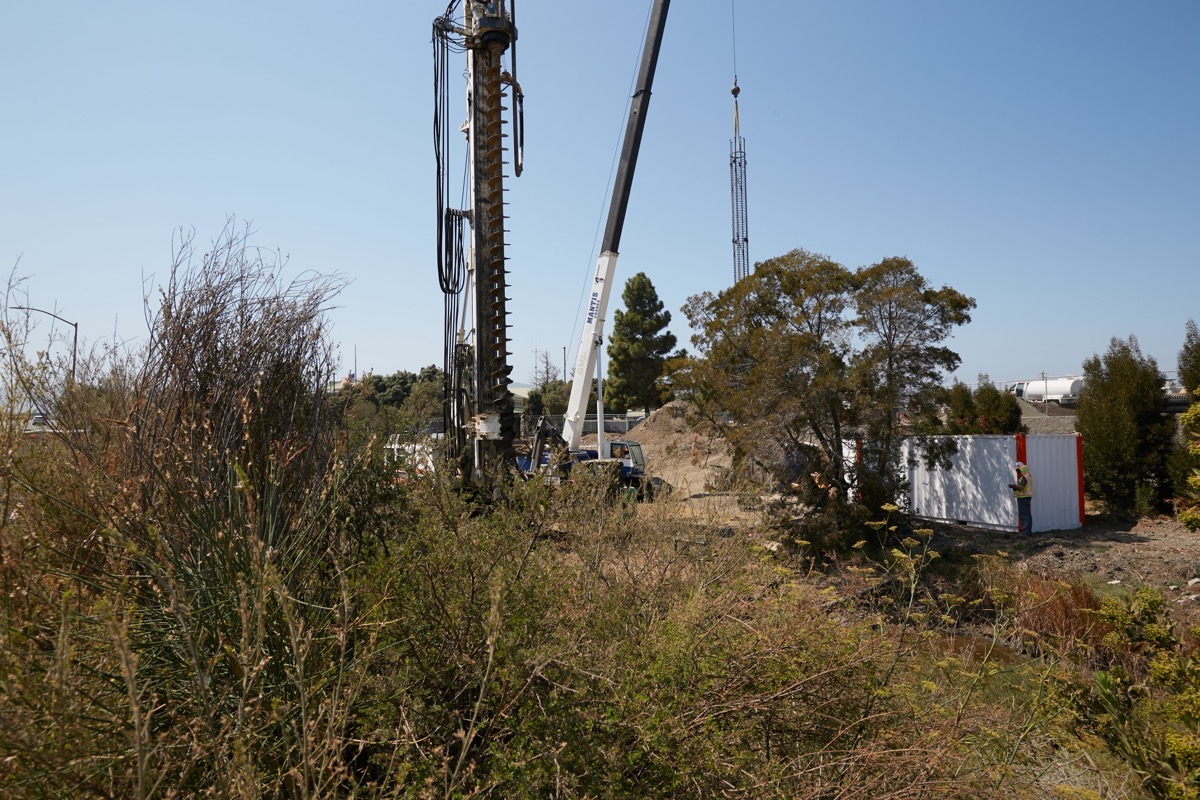 This picture shows some of the work going on at the Blomquist Extension project site. Currently, Blomquist Street dead-ends into Maple Street next to the Redwood City Police Station. This project aims to extend Blomquist between the Police Station and the Navigation Center, where it will curve left around the back of the Police Station and head towards Highway 101. The initial section of the new road has to extend across a low wetlands area; to do so, it will run along a small bridge. What you see above is the drilling rig that is being used to drill holes for the bridge’s footings, and a crane holding the rebar that will be dropped into one of those holes to provide strength for that footing. Not visible in the above is the cement mixer that will pour the cement for the footings: I couldn’t get a better angle on that today given the flurry of activity going on there right now.