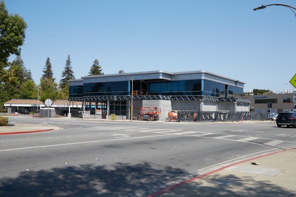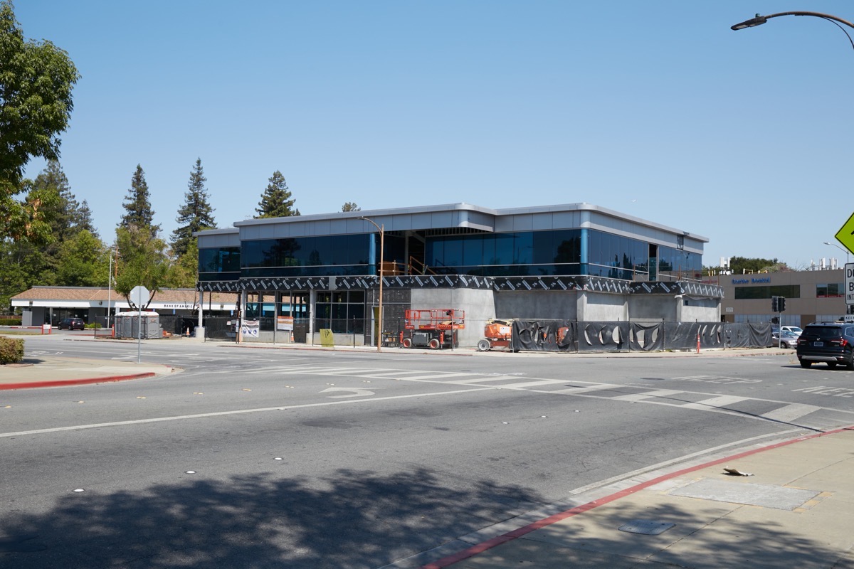 In another part of town, the above small office building is slowly nearing completion at the corner of Woodside Road and Massachusetts Avenue. The lower floor, which is almost entirely made up of a parking garage (and a small lobby) appears to be getting a stucco-type finish, while the upper floor (where all of the offices will be) is, as you can see, pretty much all glass with metal trim. More of that same metal trim will be applied to the band between the upper and lower floors that for the moment is covered by some sort of water barrier material.