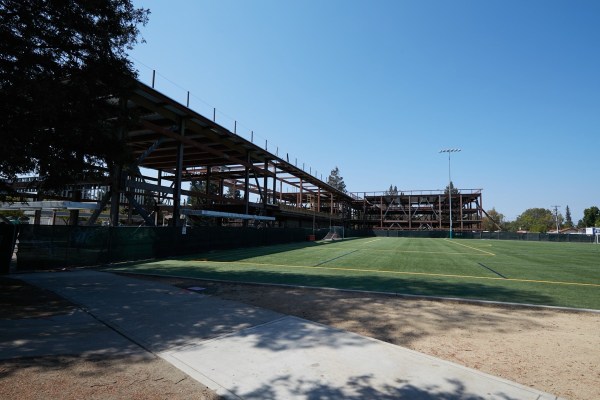 As you can see from this view (if you look closely), many of the interior walls have been framed, although they have not yet been covered with drywall. As for the wood you can see across the top of the first floor, that is just temporary. That wood is part of the form for the concrete that will provide a base for the second-story running track. Note how the ceiling is open above the track: that portion of the building will be open to the sky (the sides there will be open as well), giving runners plenty of fresh air and sunshine.