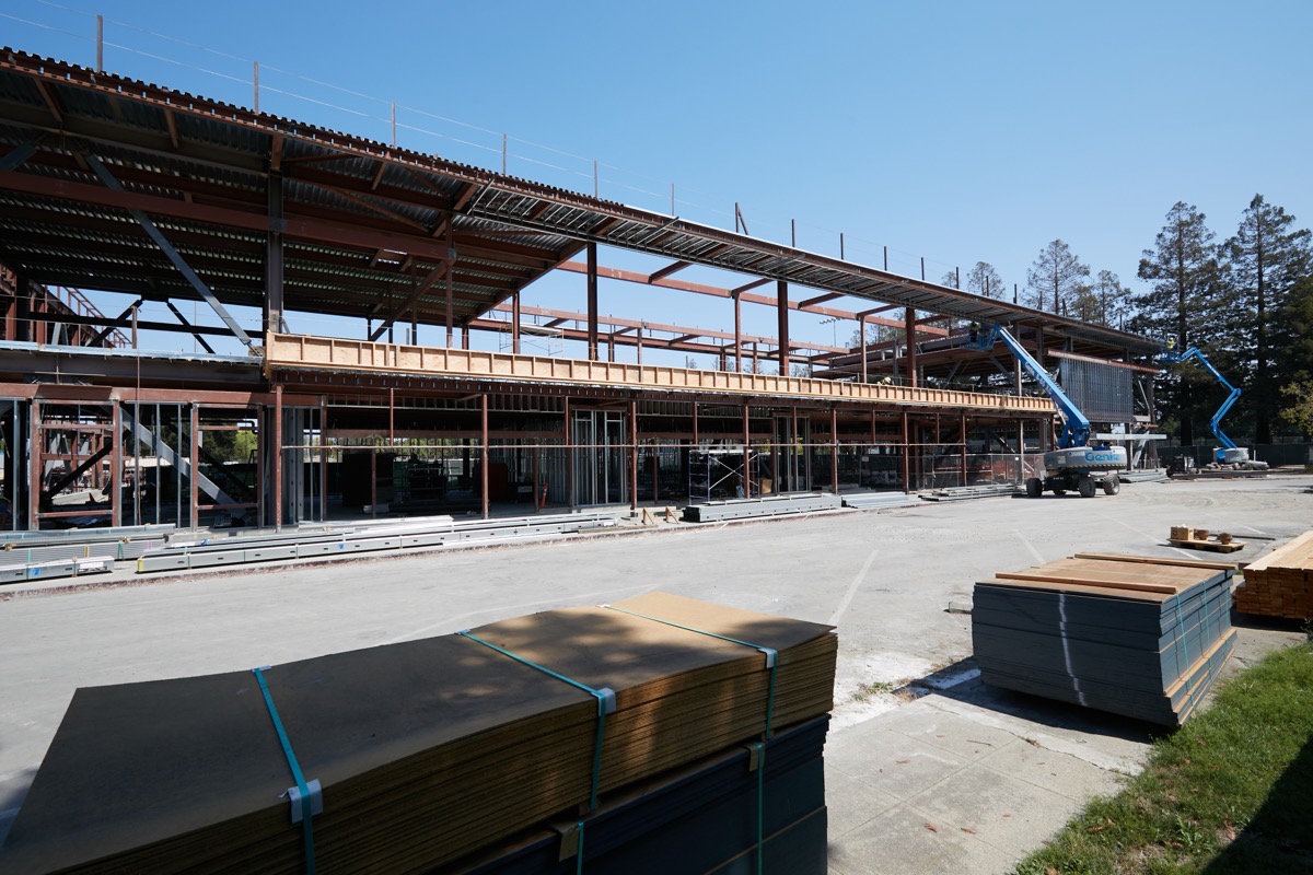 This picture shows the Navigation Center site as viewed from Maple Street near the Redwood City Police Station. The yellow building (it won’t ultimately be yellow, of course; that’s just insulation) will be the center’s dining hall. The building to its left, which currently is still in the framing stage, should be the combination Community Building/Support Center. Of all the buildings that will ultimately make up this Navigation Center, these two are pretty much the only ones being built using conventional construction methods. Pretty much everything else will be prefabricated.