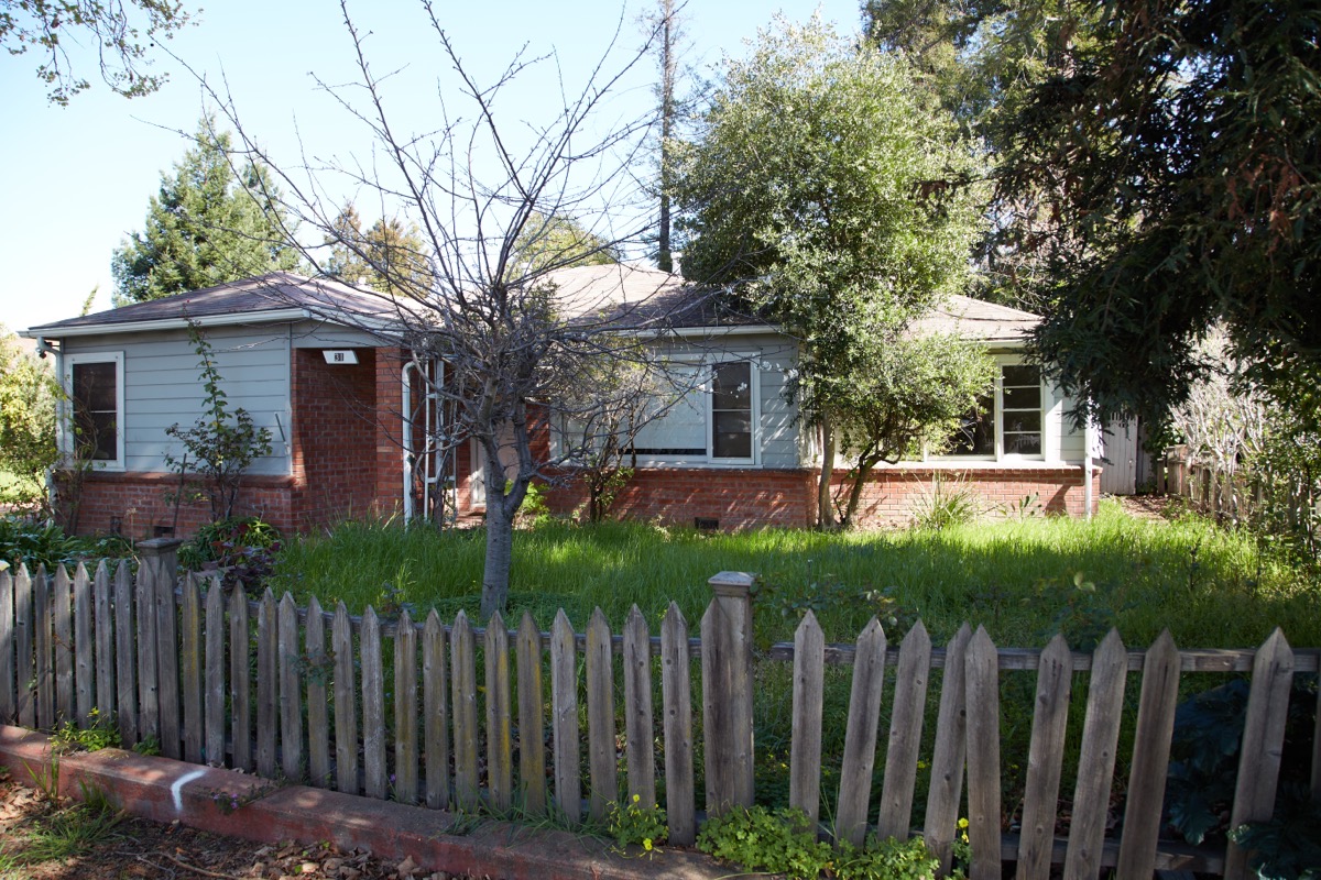 I haven’t written about this project for quite some time — it was proposed 2018 and approved in 2019, and I’ve been waiting for it to get underway ever since — so here’s a quick recap. The plan is to build seven three-story townhouse-style condominiums on the lot you see above. That lot is located at the corner of Center and Linden streets, giving it street frontage on two sides (Center Street extends westward from El Camino Real; eastward, it is the main entrance into the Target shopping center). Before the lot was cleared, it held just one single-family house with a two-car garage. This house:
