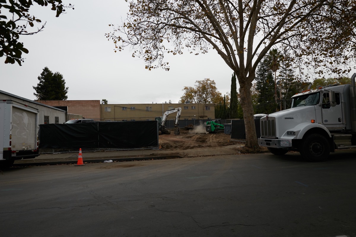The walls are complete, the roof is on, and the shell appears ready for the windows to be installed. A sign along Bay Road indicates that this new pharmacy should be ready for occupancy in “Winter 2022.” Winter is often taken to mean December-February, and I could certainly imagine that this building might be done by the end of February, but we’ll see. Whenever it turns out to be, once the lights are on and the doors are open, all work will focus on the main site; expect digging to get underway there fairly quickly after. Signs on that parcel indicate that Sobrato estimates that “phase 1” — which I believe encompasses the underground parking garage and the three residential buildings that will be built at the Chestnut Street end of the property — will be complete in spring of the year 2026. The three office buildings (which I presume make up “phase 2”) will likely be underway by that time, but won’t be completed until sometime after that.
