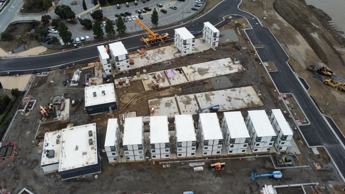 The bulk of this development, and the reason it is being built so quickly, are the prefabricated modules that make up the residential and office portions of the project. This navigation center will consist of four rows of modules, many of them stacked up to three high. As you can see, the lower row (which sits along the northeastern side of the project site) is complete, and the upper row was, as of Sunday, about half-done. The two rows in between have yet to be started, but as you can see, the foundations for them are in place.