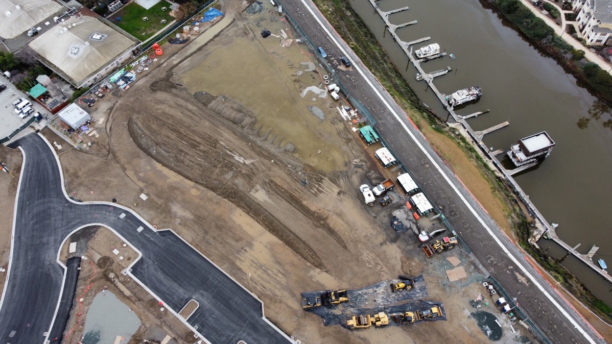 I seem to have received a late Christmas gift: a new set of aerial photographs of some of Redwood City’s most interesting projects taken by Sam Johnson. Given that a lot of Redwood City projects seem to have shifted into a low gear, likely due to our recent weather, Sam’s timing was perfect. As always, because of the unique viewpoint that drone photographs can provide, in many cases these do a much better job of illustrating the current state of a project than the photographs I typically take. For the record, all of these pictures were taken on Sunday, January 8; some of the projects may have made additional progress since then.
